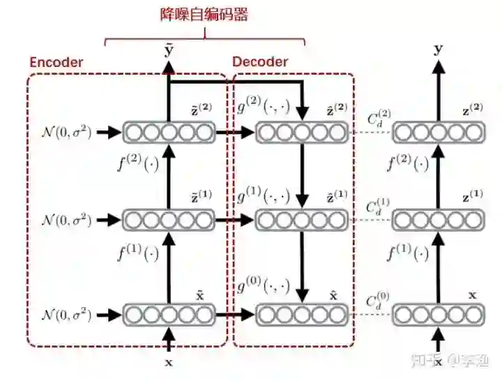 整个网络由两个部分构成,分别是降噪自编码器(Encoder+Decoder)以及无噪的前向网络(网络结构一般与 Encoder 部分一致)。此处不对网络细节做详细介绍,主要给出其中的核心思想:
