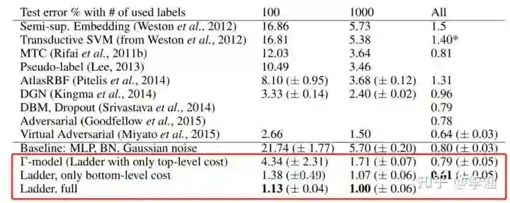 上图给出了该模型在 MNIST 数据集的实验结果。从图中可知,无论是在全数据集下,还是在 100 条的极少数据集下,本研究所提出的模型与一众其他模型相比,表现都是最优的。其中也包括2.1中提到的 Pseudo-Label 模型。尤其值得一提的是,Ladder 仅仅采用了不到 1% 的有标签数据就实现了 1% 的错误率,比完整数据集相比,仅低了 0.5%。