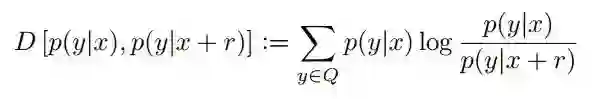 其中,r_adv 代表对输入数据所施加的对抗噪声,而 D 则是 模型对于施加噪声前后两个输入对应输出的非负度量。在 Temporal ensembling Model 中,此项为 MSE,而此处的 VAT 则采用了 KL 散度,即: