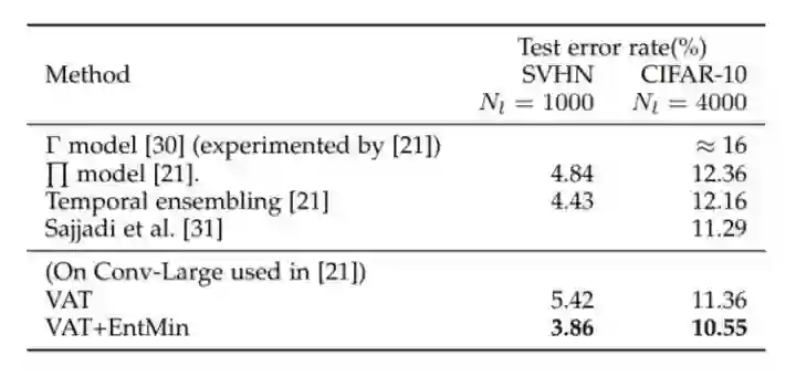 为了和其他半监督学习方法进行对比,研究人员分别在 SVHN 和 CIFAR-10 数据集上进行实验验证。从上表中可以看出,单独的 VAT (目标函数仅包含前两项)与 Temporal ensembling Model 在两个数据集上互有胜负,这取决于具体的数据集特征。而对于 VAT + EntMin 模型,在两个数据集下,相对于其他模型都是最优表现,且平均比第二名高出接近一个百分点。