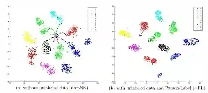 进一步,研究人员通过降维可视化的方式展示了 Pseudo-Label 模型使用前后的效果,实验数据包含 600 有标签数据 + 60000 无标签数据: