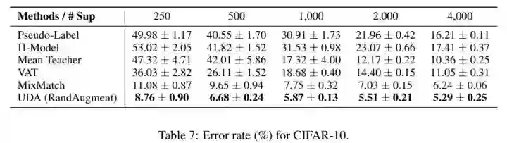 为了和前面的技术做对比,这里展示了 UDA 在 CIFAR-10 上的实验结果。从表中可知,UDA 在 MixMatch 的基础上又往前走了一步。尤其在少标签数据的情况下, UDA 技术相对于其他技术具有不可比拟的优势。
