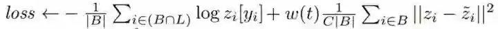 其中,第一项为交叉熵,用于计算有标签数据的误差;第二项为 MSE,用来计算无标签数据与伪标签之间的均方误差,对应前面提到的 Consistency Regulation。