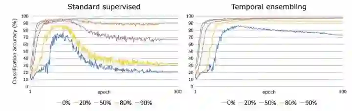 右边则展示了 temporal ensembling 的表现。这一模型对抗标签的错误标注是惊人的。从图中可以看出来,即使有一半标签是错误的情况下,模型最终的表现也与无错误的情况一致。即使在 80% 标注错误的情况下,其模型的错误率也下降不到 10%。