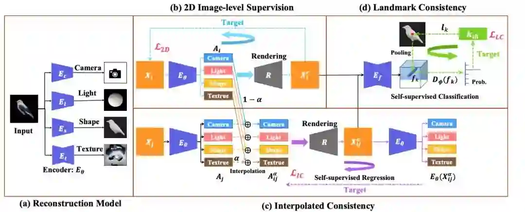 此外通过保持2D->3D->2D的双向投影来确保2D输入与预测一致,并使用GAN来对相机拍摄角度、纹理信息、物体三维等信息进行插值,生成新的数据,补充训练集,以获得较好的效果。