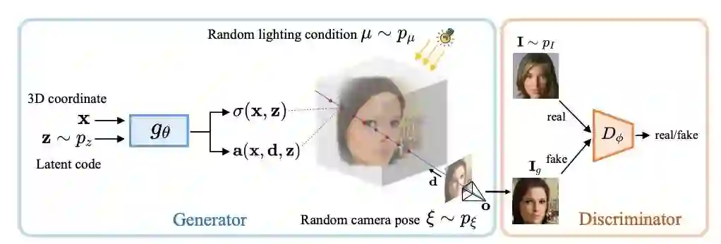 同时,作者提出了表面追踪的方法来提升体素渲染的速度。相比于pi-gan的唯一不同是,作者引入了基于光照的限制,同时输出不再直接输出颜色,而是输出经过映射前的输入,目的是希望引入光照来进行后处理,具体处理方法为Lambertian shading。