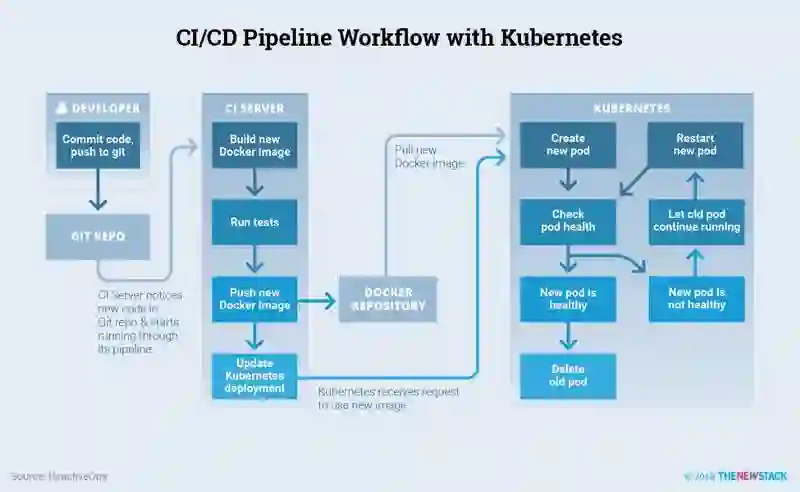 设置持续集成 / 持续交付 (Continuous Integration/Continuous Delivery,缩写为 CI/CD),这样源代码的更改会自动导致构建、测试并部署一个新容器,并最终(可能)部署到生产环境中。接下来我们需要设置的是自动部署、回滚和测试。CI/CD 有很多平台:Jenkins、VSTS、Azure DevOps、TeamCity、JFRog、Spinnaker 等等。