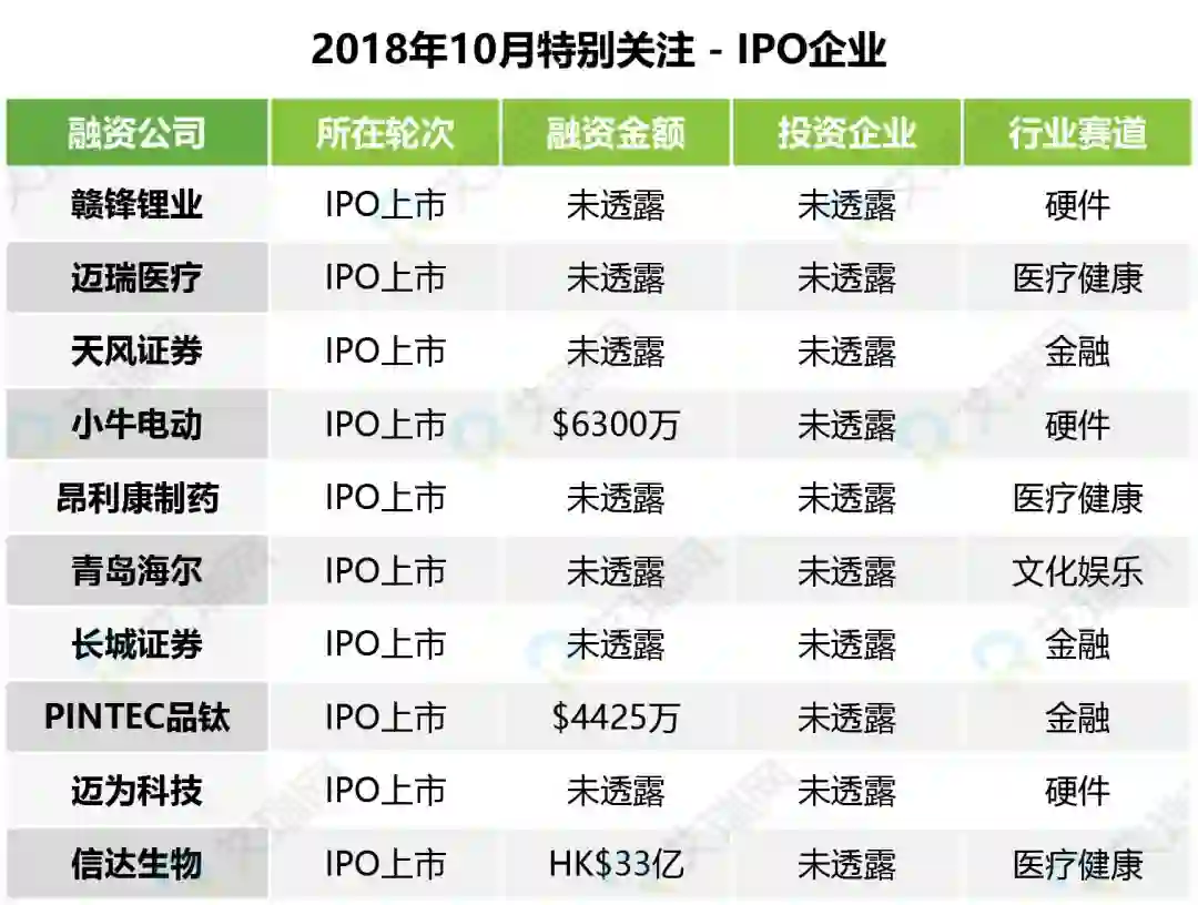 10月国内上市企业数达10家,相比上个月15家有所减少。本月上市企业领域分布较为平均,以硬件、医疗健康和金融为主,仅有的一家文化娱乐企业为青岛海尔。