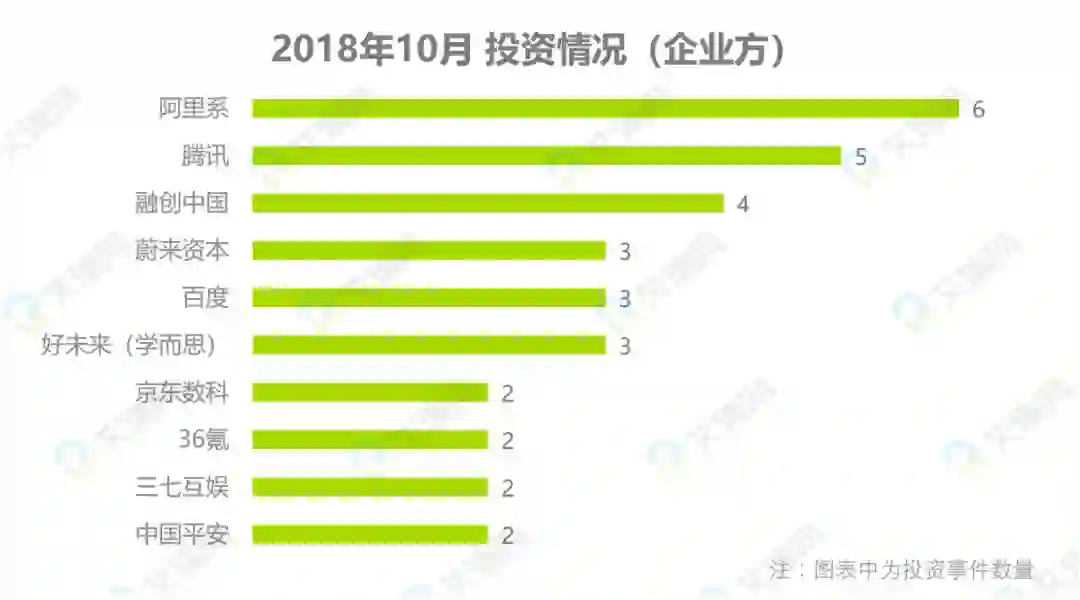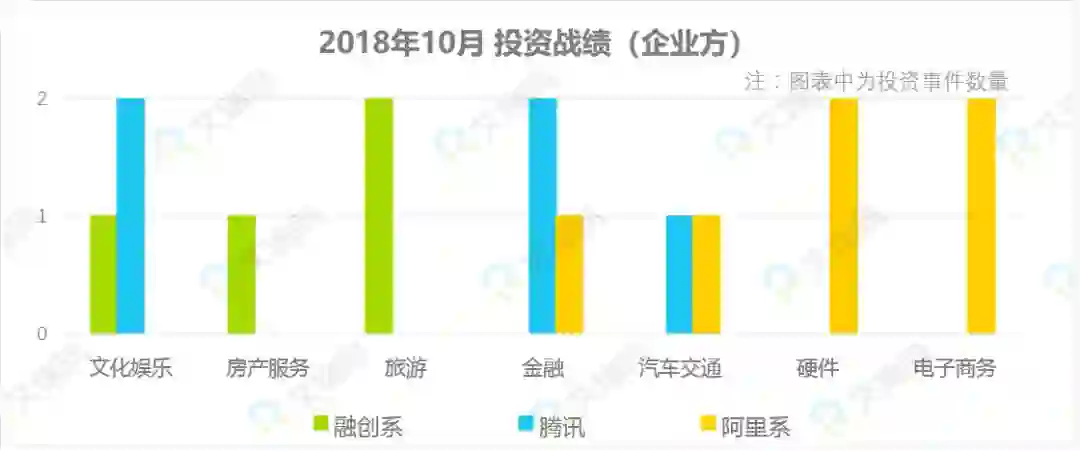 2018年10月投资盘点企业方投资行业事件数前三名分别为阿里系(阿里巴巴及菜鸟网络、蚂蚁金服等相关企业)腾讯及融创系(融创中国&信达融创)。