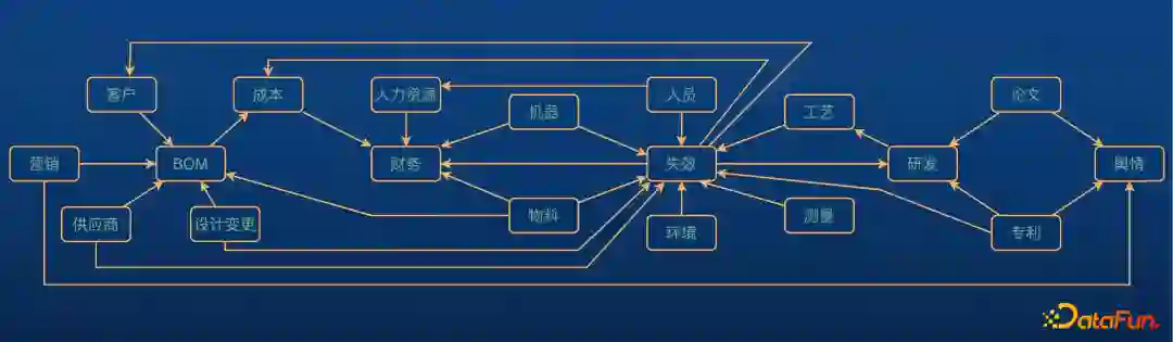 上图展示了一个已构建的知识图谱的简化版schema,可以看出产品、设备、研发、生产、管理、售后、售前等各个环节都与失效有关。除了常见的“人机料法环测”等主要维度,故障和失效还与人力资源、成本,以及BOM数据产生关联;而BOM数据则与设计变更、供应商、客户、营销等因素可产生进一步的关联。在研发端,研发的相关知识,包括论文、专利、舆情等,以及竞品相关的说明文档等,都可以与故障和失效进行关联,从而全方位地完善FMEA知识图谱中的核心知识和基础知识,实现失效知识的融会贯通。