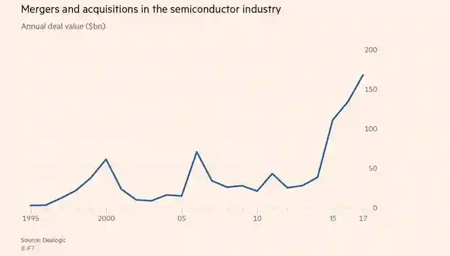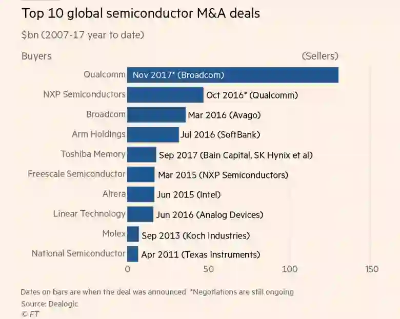 半导体公司试图为自己重新打造品牌形象的同时,交易者也在疯狂涌入这一领域。自2015年以来,芯片行业发生的并购交易数额已超过1500亿美元。这个数额早于博通对高通1300亿美元的收购邀约。