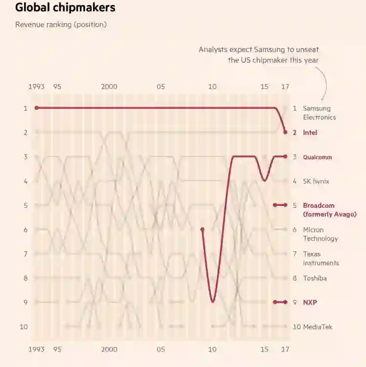 【新智元导读】最近,博通报价1300亿美元收购高通的请求被拒绝,但这显然只是芯片巨头之间硝烟弥漫的战争中的一个掠影。先前芯片业快速增长的源泉已经枯竭,人工智能迅速崛起的背景下,AI芯片又成为一个必争之地。接下来,围绕人工智能特别是深度学习技术,芯片行业还将产生更多资本的交易,并购、投资会不断上演,不过奇怪的是,似乎各大公司给自己的定位都不再是一家芯片公司。本文综合了《金融时报》、《经济学人》等知名媒体的分析,用数据和图表剖解人工智能大潮下的芯片巨头的群雄之争。