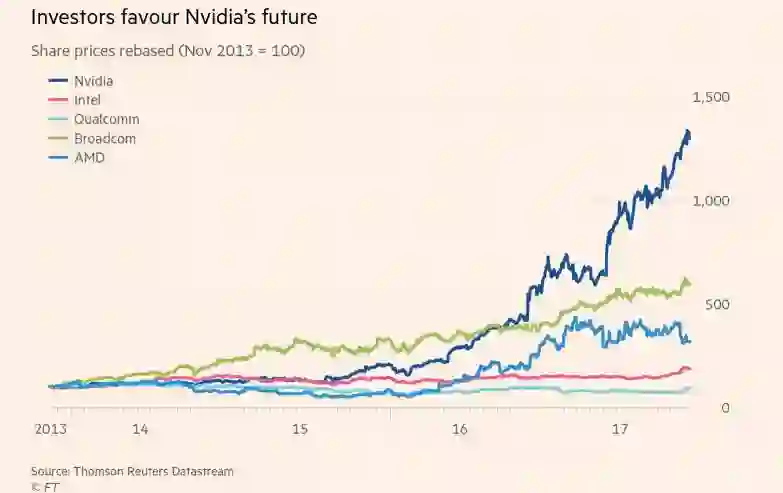 在自动驾驶汽车和人工智能领域,英特尔和英伟达正在彼此追赶。英伟达的图形处理器已经被深度学习的研究人员热切地采用。去年,英伟达是标准普尔500指数表现最好的股票,上涨了224%。其股价今年再次翻番。