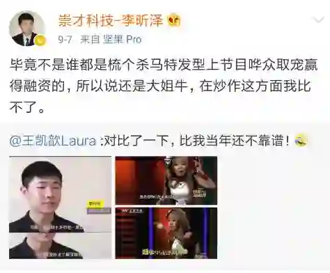 比较有意思的是,李昕泽随即转发了此条微博并表示:“毕竟不是谁都是梳个杀马特发型上节目哗众取宠取得融资的,所以说还是大姐牛,炒作这方面我比不了。”