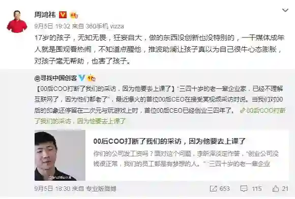 而作为中国最成功的创业者之一,360公司董事长周鸿祎也曾在微博上发表了自己的看法,称 “17岁的孩子,无知无畏,狂妄自大,做的东西没创新也没特别的,一干媒体成年人就是围观看热闹,不知道点醒他,推波助澜让孩子真以为自己很牛心态膨胀,对孩子毫无帮助,也害了孩子。”