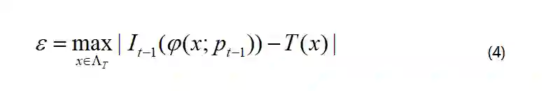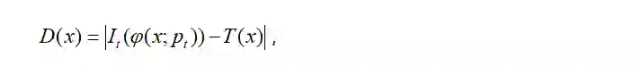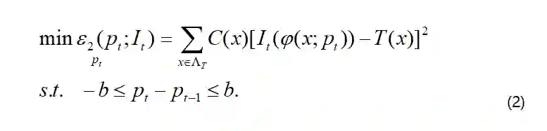 对于传入帧It,运动参数最初估计为pt=pt-1。根据均值伪反转法(PMJ),位移Δp计算为