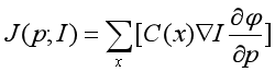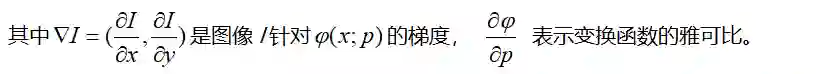 先考虑无约束的置信度匹配问题,即,放弃公式(2)中的约束条件。用J(p;I)表示的目标函数ε2针对参数p和图像I的雅可比矩阵,我们有