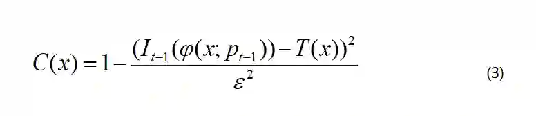 对于每个像素x,置信度图C被均匀初始化,并且根据之前观察和模板之间的差异每帧进行更新