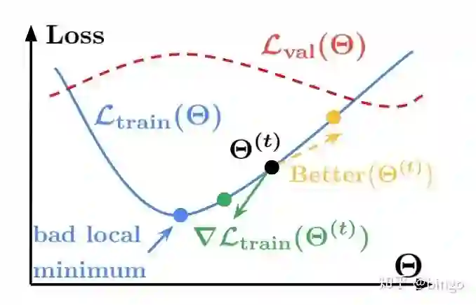 MPL的主要思想如图1,按照正常的模型训练,那么梯度更新之后,会到到达蓝色的点(训练损失较小)。但是我们发现,在蓝色的点,验证集损失很大,所以这是一个比较坏的局部极小值。MPL的策略是通过验证集的损失来防止训练模型陷入这种比较坏的局部极小值。也就是说训练过程中,要考虑模型在验证集合上面的性能,防止过拟合训练集。