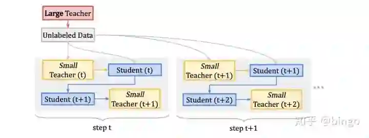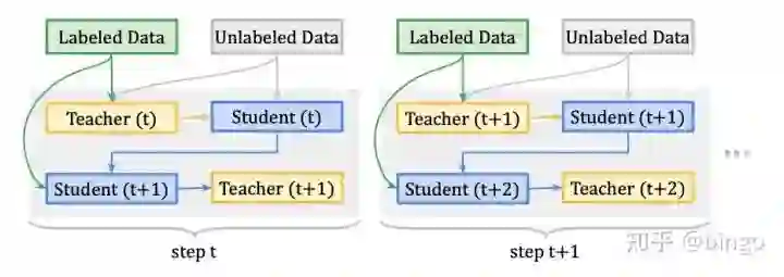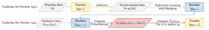 在更新Teacher模型的过程中, 会产生梯度的梯度,这个过程和meta-learning非常相似,也就是文章名字的来源。更具体的,优化过程可以写成下面的形式: