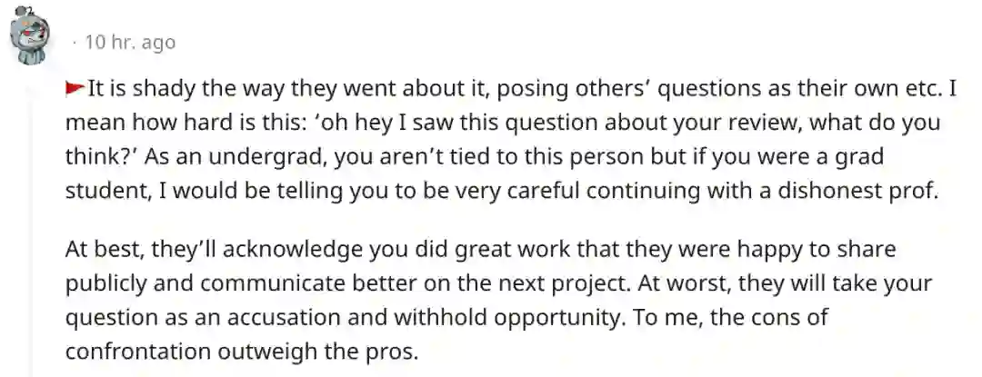 比如开头在reddit上喊冤的学生苦主,教授不仅把学生的论文评审意见偷去发表,还把别人的相关评审意见说成是自己的观点让苦主继续回应。
