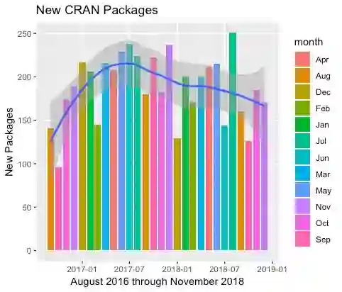 在过去28个月,每月平均有181个R新包收录于CRAN,增速惊人!下图为自2016年至今,R新包的收录数量趋势。