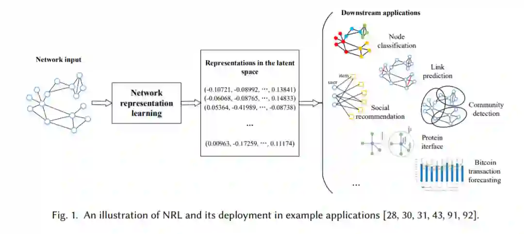 网络表示学习(Network representation learning, NRL),又称网络嵌入(Network embedding),是训练神经网络将信息网络表示为潜在空间中节点嵌入向量的集合,从而保留所需的网络特征,使训练良好的NRL模型能够进行网络分析。如链路预测或节点聚类,如图1所示。NRL的目标是利用深度学习算法将有用的网络信息编码到潜在的语义表示中,可用于执行流行的网络分析,如节点分类、链接预测、社区检测和特定领域的网络挖掘,如社会推荐[28,91],蛋白对蛋白相互作用预测[30],疾病基因关联鉴定[43],分子自动优化[31]和比特币交易预测[92]。