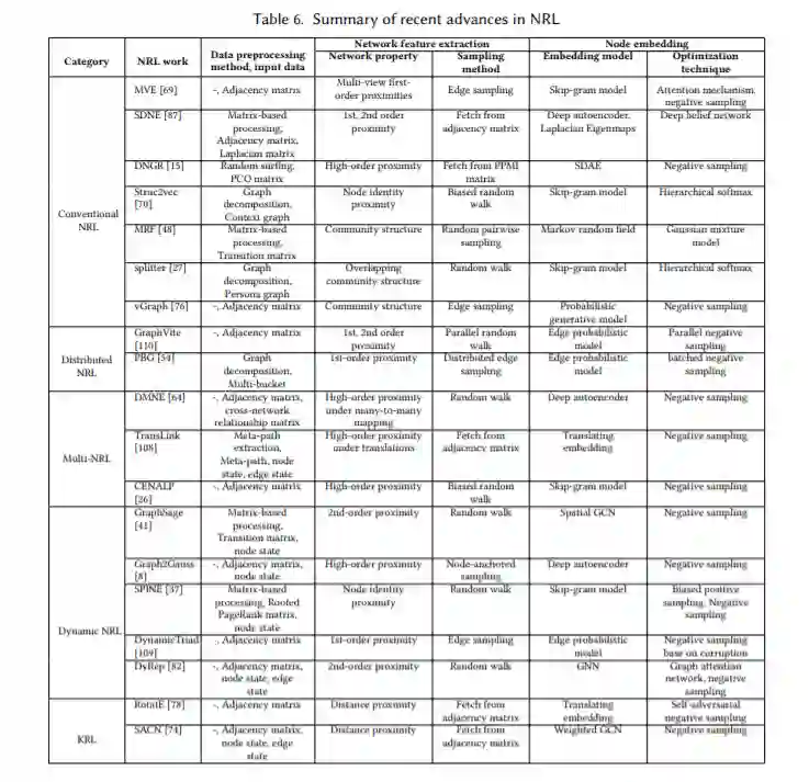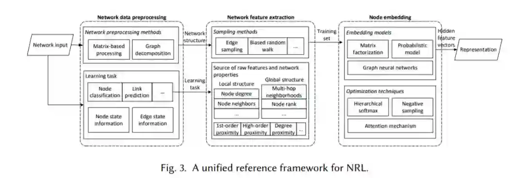 目前的综述[13,20,40]主要集中在提出一个分类来回顾网络表示学习的现有工作。[13]分别提出了基于问题设置和技术的图嵌入两种分类法,于2017年首次在ArXiv上出现,并于2018年发表。[20]根据保留的信息类型提出了网络嵌入的分类。[40]于2017年出现在IEEE Data Eng杂志上。本文介绍了一套传统的节点嵌入方法,重点介绍了基于成对邻近的方法和基于邻域聚合的方法。相比之下,我们统一的参考框架提供了一个更广泛、更全面的网络表示学习现状的比较综述。在我们的三个阶段的参考框架中,每个阶段都是一组专门用于这一阶段的任务的技术解决方案的分类。例如,我们不仅回顾了使用统一框架的节点嵌入模型,还描述了一组在不同的节点嵌入方法中常用的优化技术,并概述了NRL的最新进展。