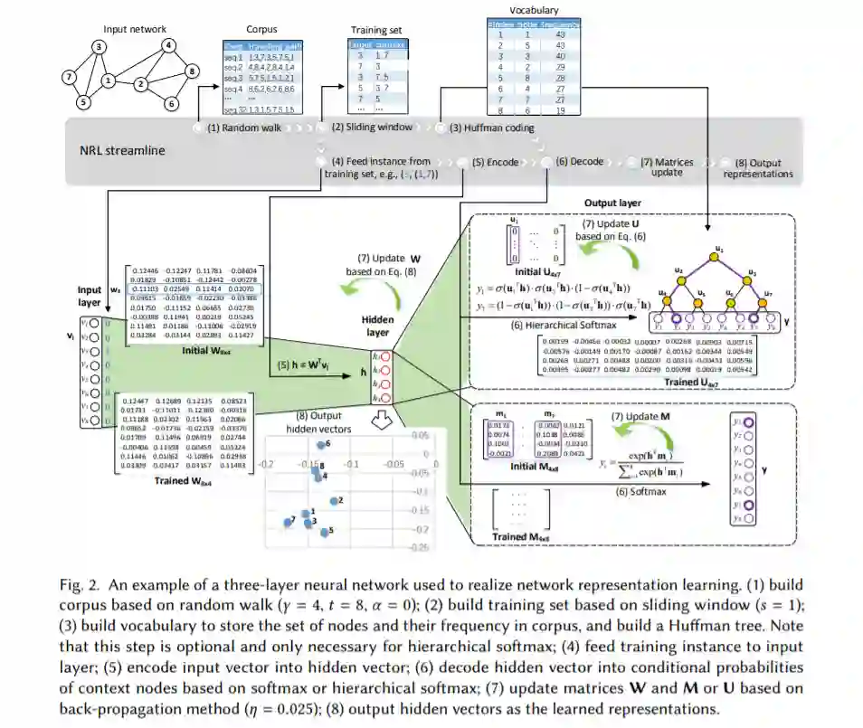 为了方便参考,我们在表1中列出了整个论文中使用的数学符号。本综述的其余部分结构如下。在第2节中,我们描述了使用自动编码器方法生成节点嵌入的网络表示学习的基本步骤。在第3节中,我们概述了统一的NRL三阶段参考框架,并讨论了在每个阶段使用的代表性方法、模型和优化技术。在第四章中,我们回顾了传统NRL、分布式NRL、多分布式NRL、动态NRL和基于该参考框架的知识图表示学习的最新进展,并讨论了几个有待解决的问题。在第5节中,我们总结了我们的综述。
