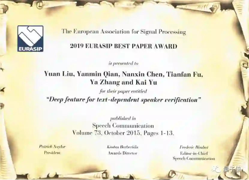 值得注意的是,这项研究在2019年获得了语音领域权威期刊Speech Communication的最优论文奖。