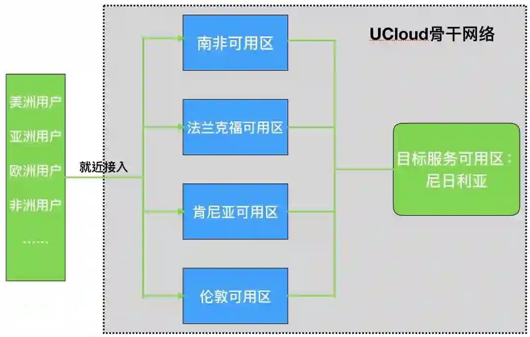 2018 年 9 月 25 日,UCloud 拉各斯数据中心落地。第一步解锁尼日利亚后,非洲业务板块愈加清晰:西非以尼日利亚、加纳为主;东非以肯尼亚、坦桑尼亚、埃塞俄比亚为主;北非埃及、摩洛哥;南非。但是,我们的用户目标覆盖非洲全大陆,现实瓶颈却是跨国互联访问体验差,甚至有的邻国访问绕行欧洲伦敦或阿姆斯特丹。