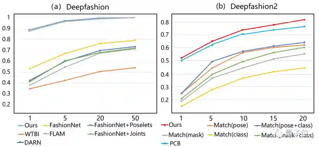 在同款服装检索实验中,他们选用了FashionNet, Match-RCNN, PCB等方法作为对比,在Deepfashion和Deepfashion2上分别进行了实验。