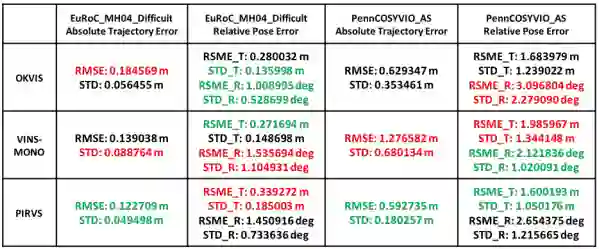 我们在多个公共的视觉-惯性数据集上对提出的系统进行了全面的评估。实验结果显示,我们的系统在个人电脑上和最先进的视觉-惯性算法在精度上旗鼓相当,而在PIRVS硬件上,我们的算法更高效。