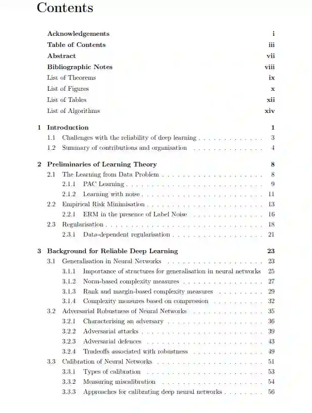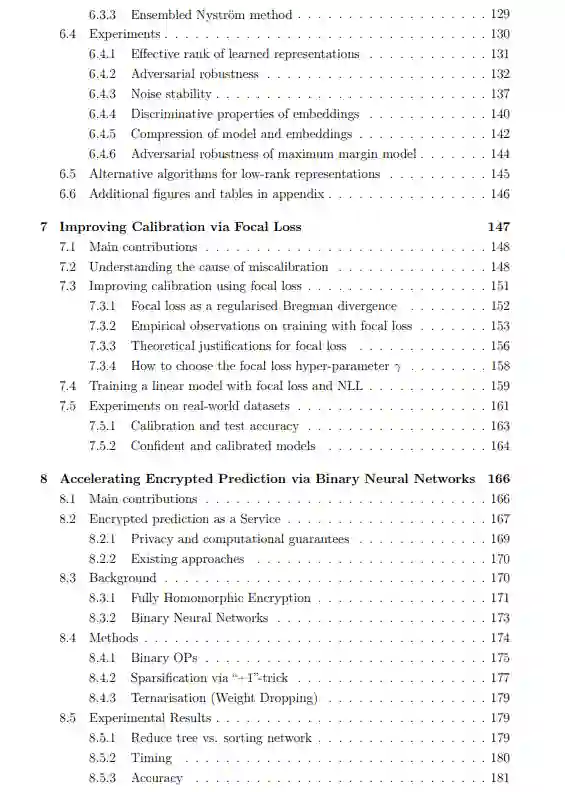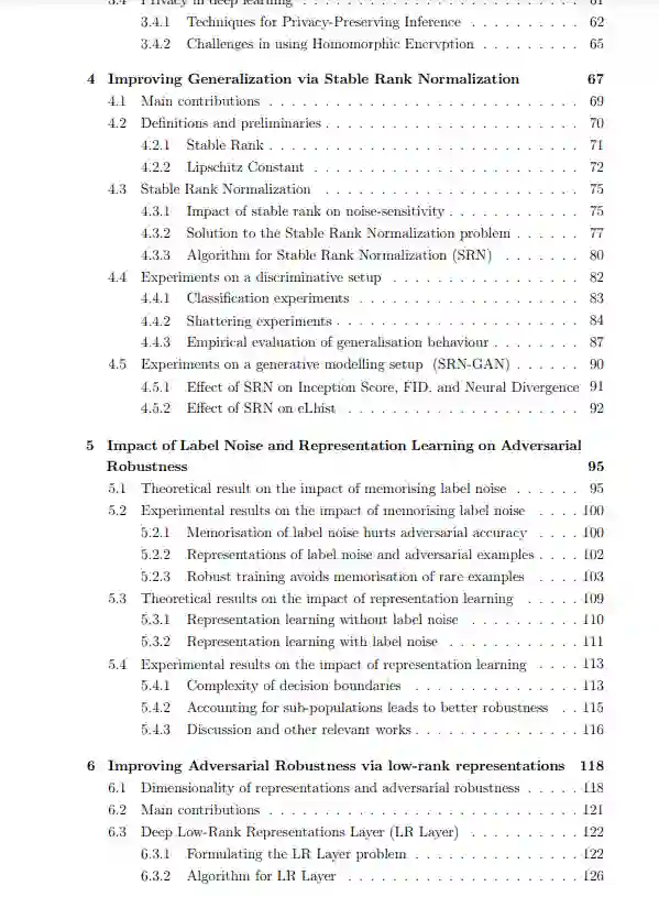 最近,深度学习研究在包括计算机视觉、自然语言处理和强化学习在内的广泛任务中取得了令人印象深刻的快速进展。这些系统的非凡性能常常给人一种印象,即它们可以用来使我们的生活变得更好。然而,正如最近的研究指出的,这些系统存在一些问题,使其在现实世界中使用不可靠,包括易受对抗性攻击(Szegedy等人[243]),倾向于记忆噪声(Zhang等人[286]),对错误的预测(错误校准)过于自信(Guo等人[99]),以及不适合处理私人数据(Gilad-Bachrach等人[88])。在本分析中,我们将详细研究这些问题,研究它们的原因,并提出在实践中减少它们的计算成本低廉的算法。为此,我们确定了深度神经网络中的结构,可以利用这些结构来减轻上述导致深度学习算法不可靠的原因。在第4章中,我们展示了最小化神经网络中单个权重矩阵的矩阵的一个属性,称为稳定秩,降低了网络记忆噪声的趋势,而不牺牲其在无噪声数据上的性能。在第5章中,我们证明了记忆标签噪声或进行不适当的表示学习使实现对抗鲁棒性成为不可能。第6章表明,神经网络表示空间上的低秩先验增加了神经网络对对抗性扰动的鲁棒性,而在实践中不会导致与精度的任何权衡。在第7章中,我们重点介绍焦点损失(focal loss)的使用,它根据神经网络对每个样本的分类情况,对单个样本的损失分量进行差异加权,作为交叉熵的替代损失函数,以最小化神经网络中的错误校准。在第8章中,我们首先定义了一个名为加密预测即服务(Encrypted Prediction As a Service, EPAAS)的新框架,以及一系列计算和隐私约束。然后,我们提出使用一种完全同态加密[84]方案,该方案可与二元神经网络[61]一起使用,以及一组代数和计算技巧,以满足我们对EPAAS的所有条件,同时计算效率高。