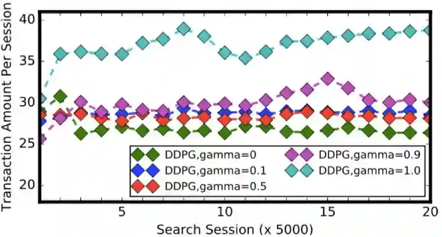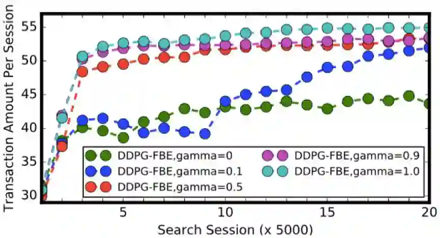 。我们设置了 0、0.1、0.5、0.9 和 1.0 五组折扣率,分别测试 DDPG-FBE 算法和 DDPG 算法在不同折扣率下的性能。同时,为了和两个强化学习算法进行对比,我们也实现了五个 online LTR 算法:point-wise LTR 算法、BatchRank 算法 [1]、CascadeUCB1 算法 [2]、CascadeKL-UCB 算法 [2] 和 RankedExp3 算法 [3]。同 DDPG-FBE 和DDPG 类似,我们实现的 point-wise LTR 算法学习也是在搜索会话的每个状态下输出一个 20 维的排序权重向量。我们采用深度神经网络作为 point-wise LTR 的模型,并用 logistic regression 算法对其进行训练,训练目标为最大化总成交额。其他的 online LTR 算法则是基于的多臂老虎机模型的遗憾最小化算法(regret minimization algorithm)。对每个算法的测试包含 100,000 个搜索会话,我们记录下被测算法在每个搜索会话中引导的成交额,并将结果展示在图 3、图 4 和图 5 中。
