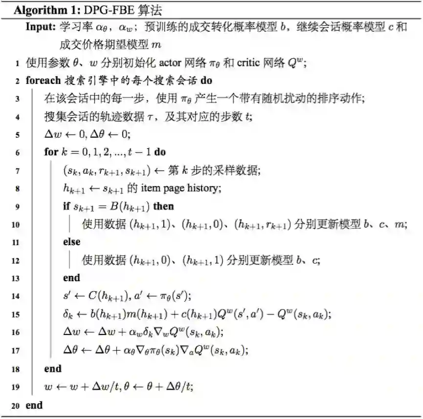 如算法 1 所示,DPG-FBE 算法的策略函数参数 和值函数参数 会在每个搜索会话结束后进行更新。为了保证算法学习到好的排序策略,探索(Exploration)机制必不可少(算法第 行)。对于离散动作空间问题,探索可以通过 -贪心方法实现;而对于连续动作空间问题,探索则可以通过对 的输出添加高斯噪音来实现。DPG-FBE 算法并未对策略函数 和值函数 采用的具体模型做任何假设,但由于 Search Session MDP 通常具有很大的状态空间和动作空间,所以我们建议尽量采用非线性模型(例如:神经网络)来进行学习。为了确保学习的稳定性以及解决函数近似带来的收敛性问题,样本池(replay buffer)和目标更新(target update)等 [12, 13] 在深度强化学习中广泛应用的技巧,也建议在 DPG-FBE 算法的具体实现中采用。