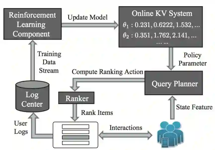 在 online acting loop 中,每当有用户发出商品页面的请求时,查询规划器(关键词 planner)将抽取当前搜索会话的状态特征,从在线 KV 系统中获取当前的排序策略模型参数,从而计算出当前状态下搜索引擎的排序动作。在这之后,排序打分器(ranker)将接收这个排序动作,对商品进行打分,并将 Top K 商品展示到一个商品页面中。用户看到该商品页面之后,就能对页面上的商品进行相应的操作。与此同时,用户在商品页面上的各种行为将会以日志的形式记录到日志中心,作为训练学习算法的数据源。在日志中心,从不同搜索会话中产生的用户日志数据都会转化为形如 (s,a,r,s')的训练样本。这些样本将以数据流的形式不断地输出给强化学习组件,用于策略模型参数的更新。每当策略模型有更新时,新的模型将被写入在线 KV 系统。这时,搜索引擎就可以采用更新后的排序策略来产生排序动作,对商品进行排序。需注意的是,整个系统的两个循环是并行的,但并非同步。这是因为,用户在搜索会话中产生的行为日志并不能立即被用来对算法进行训练。