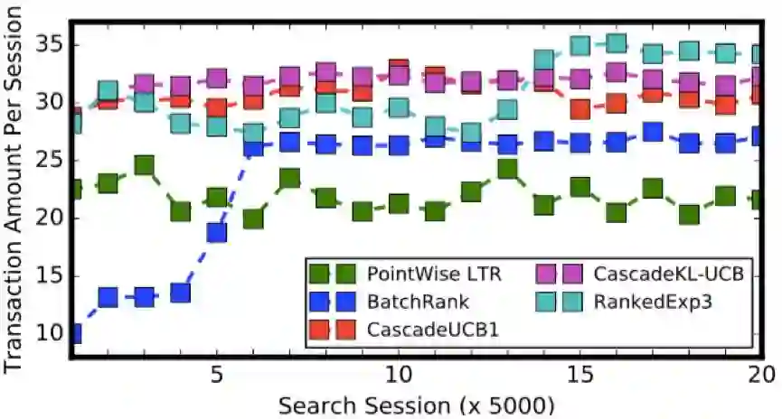 用户在搜索会话中的操作(比如:点击商品)是反映用户对商品偏好的信号。从统计的角度来看,这些信号可以用来学习排序打分函数,使得用户更喜爱的商品(比如:点击率更高的商品)能够有更高的排序分数或次序。Learning to Rank(LTR)方法正是基于这样的思想而提出。早期基于监督学习的 LTR 方法大致可以分为 Point-wise LTR、Pair-wise LTR 以及 List-wise LTR。最近十多年,在线学习的理论模型和技术也被很多研究者将引入到 Learning to Rank 领域中,使得一系列 Online LTR 方法被相继提出,如:BatchRank [1]、 CascadeKL-UCB [2]、RankedExp3 [3] 等。