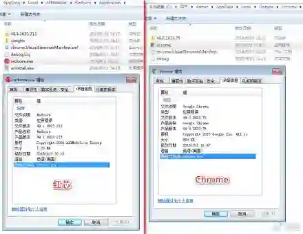 不过就在红芯融资的消息被各大媒体报道的同时,有人将红芯浏览器的Windows版本下载安装后发现,红芯浏览器的众多设置与谷歌Chrome雷同,安装文件的目录结构也很相似,安装程序Redcore.exe的属性甚至显示为Chrome。而在将安装文件不断解压之后,甚至还有Chrome的logo。
