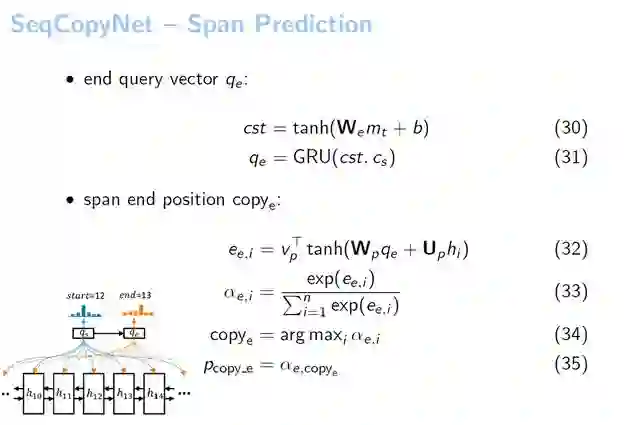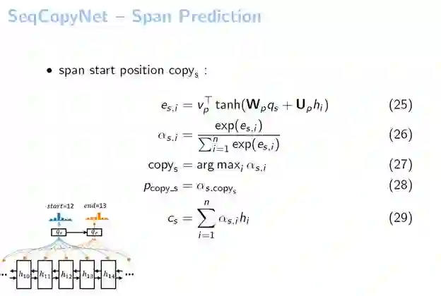 有了qs之后,我们直接把它作为一个pointer network的输入。在整个句子中做了一个Attention,可以看到COPYs是取概率最大的位置。从这个图例中我们看到系统用qs在输入当中进行了一个Attention,最大的位置我们假设是12,它就选择出来COPY的起始位置是12。