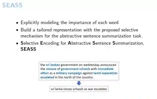 首先介绍一下我们如何从编码器端改进生成式句子摘要。这是我们2017年在ACL上的一个工作,今天介绍的工作也都是我在微软亚洲研究院实习期间完成的。