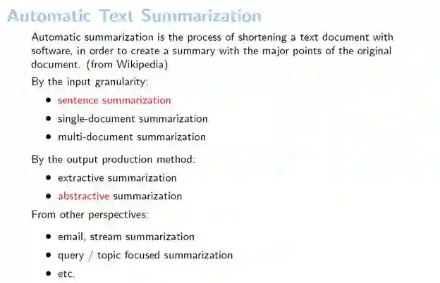 文本自动摘要可以分成不同的种类。按照输入文本的类别来分,输入最短的是句子摘要,输入稍微长一点的是单文档级的摘要,在单文档级别摘要之上还有多文档的摘要。
