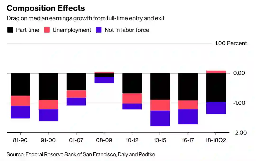 结构性效应:进入或退出全职就业状态对工资涨幅中位数的拖累。资料来源:旧金山联邦储备银行、论文作者