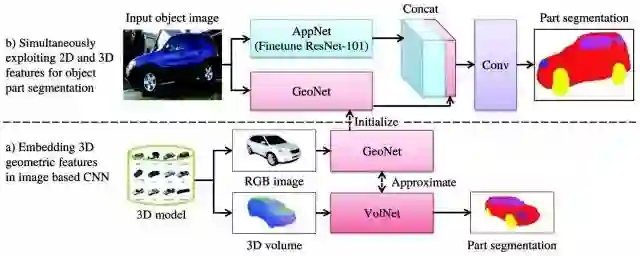 Object part segmentation is a challenging and fundamental problem in computer vision. Its difficulties may be caused by the varying viewpoints, poses, and topological structures, which can be attributed to an essential reason, i.e., a specific object is a 3D model rather than a 2D figure.Therefore, we conjecture that not only 2D appearance features but also 3D geometric features could be helpful.