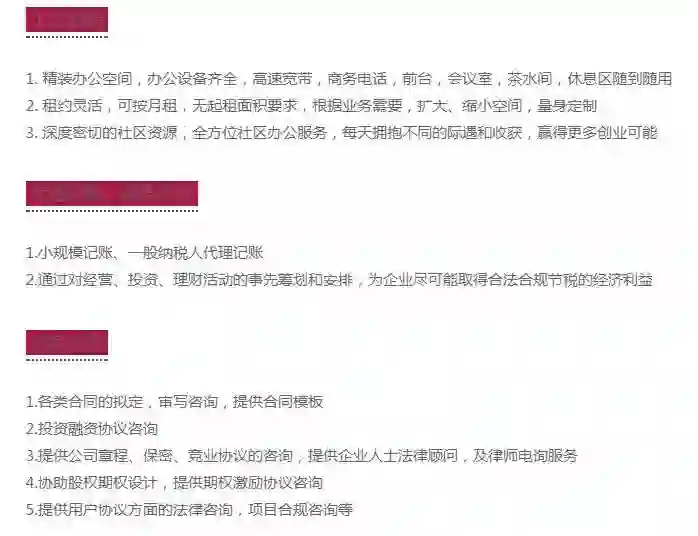 100创客官网信息显示,其提供的服务包括注册服务、培训服务、项目咨询管理服务、代理记账、税务代办和法务咨询等。