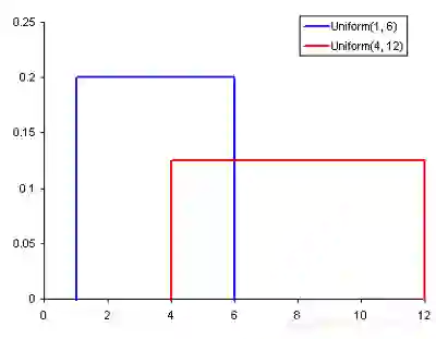 均匀分布是其中最基本的概率分布方式。它有一个只出现在一定范围内的值,而在该范围之外的都是0。我们也可以把它考虑为是一个具有两个分类的变量:0或另一个值。分类变量可能具有除0之外的多个值,但我们仍然可以将其可视化为多个均匀分布的分段函数;