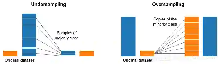 在上面图中的左右两侧,蓝色分类比橙色分类有更多的样本。在这种情况下,我们有2个预处理选择,可以帮助机器学习模型进行训练。