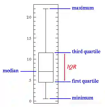 上图中,中间的直线表示数据的中位数。中位数用在平均值上,因为它对异常值更具有鲁棒性。第一个四分位数本质上是第二十五百分位数,即数据中的25%要低于该值。第三个四分位数是第七十五百分位数,即数据中的75%要低于该值。而最大值和最小值表示该数据范围的上下两端。