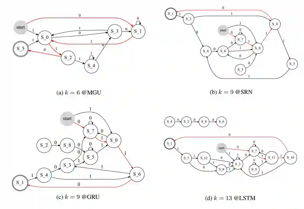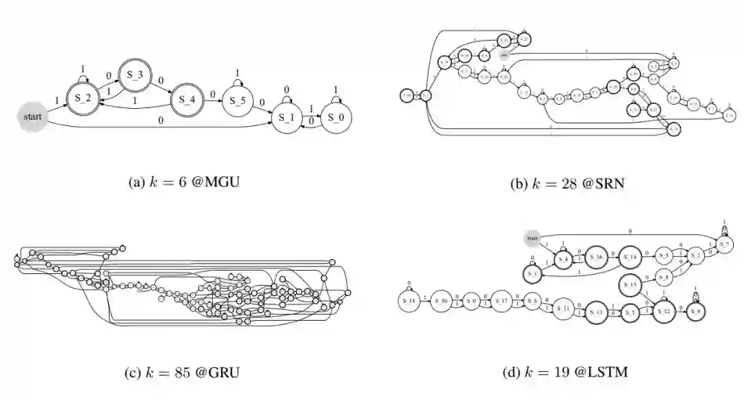 为了从 RNN 中学习 FSA,并使用 FSA 解释 RNN 的内在机制,我们需要知道如何学习 FSA 以及具体解释 RNN 中的什么。对于如何学习 FSA,研究者发现非门控的经典 RNN 隐藏状态倾向于构造一些集群。但是仍然存在一些重要的未解决问题,其中之一是我们不知道构造集群的倾向在门控 RNN 中是否也存在。我们同样需要考虑效率问题,因为门控 RNN 变体通常用于大型数据集中。对于具体解释 RNN 中的什么,研究者分析了门控机制在 LSTM、GRU 和 MGU 等模型中的作用,特别是不同门控 RNN 中门的数量及其影响。鉴于 FSA 中状态之间的转换是有物理意义的,因此我们可以从与 RNN 对应的 FSA 转换推断出语义意义。