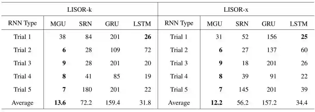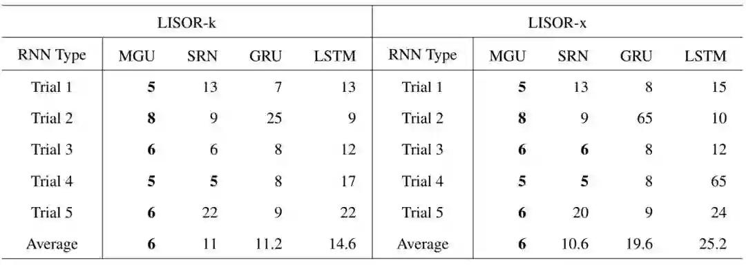 表 2:分别基于 LISOR-k 和 LISOR-x 方法,当从 4 个 RNN 中学习到的 FSA 在任务「0110」的准确率首次达到 1.0 时,集群的数量(n_c)。注意这些值是越小越高效,并且可解释性越好。不同试验中训练得到的 RNN 模型使用了不同的参数初始化。